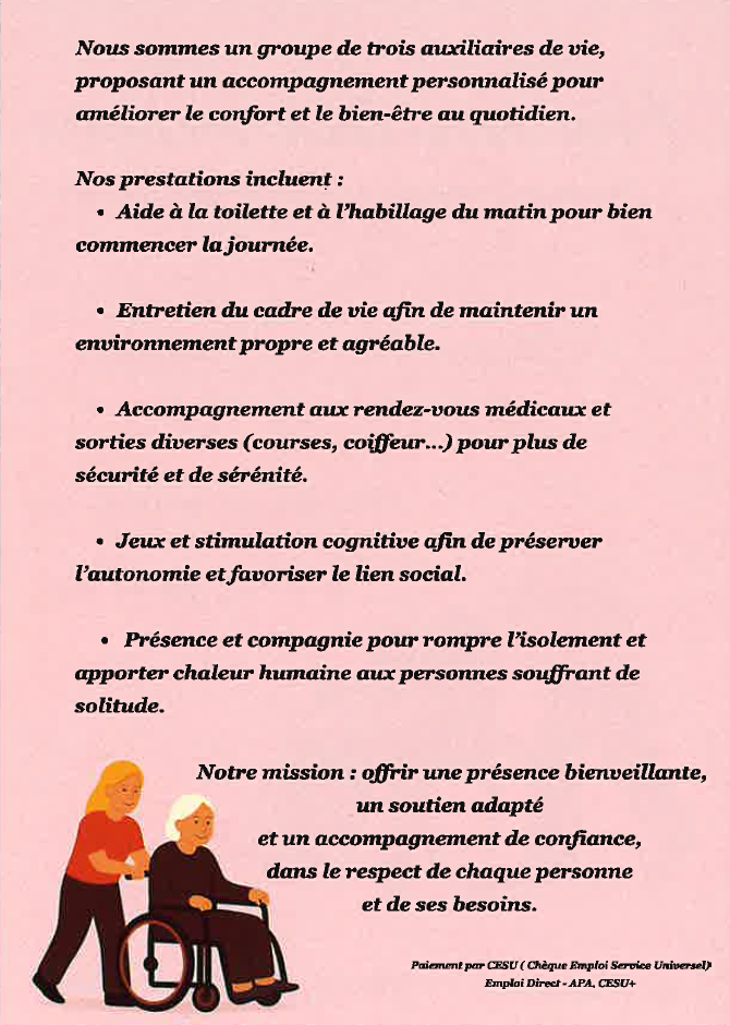Leur mission : offrir une présence bienveillante, un soutien adapté et un accompagnement de confiance, dans le respect de chaque personne et de ses besoins.